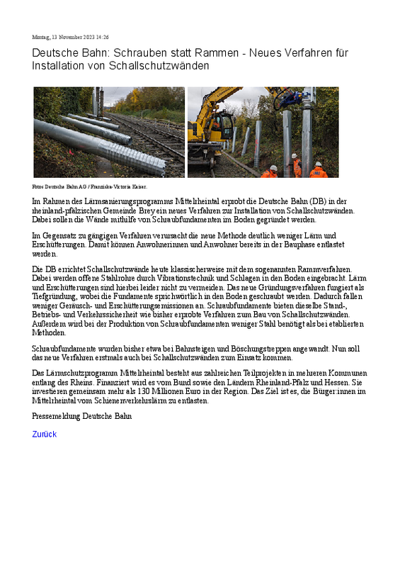 Neben zahlreichen Magazinen hat auch der Lok Report über das gemeinsame Projekt zwischen der Deutschen Bahn und den KRINNER Schraubfundamenten berichtet. Am 13. November 2023 wurde der Artikel "Deutsche Bahn: Schrauben statt Rammen - Neues Verfahren für Installation von Schallschutzwänden" durch die Redaktion veröffentlicht. Wie immer ist das KRINNER-Team sehr stolz auf die großartige Zusammenarbeit und das erfolgreiche Projekt. Die Fundamentierung der Lärmschutzwände könnte künftig vermehrt mit den KRINNER Schraubfundamenten erfolgen. Diese stellen im Bereich der Infrastruktur und Verkehrstechnik eine lärm- sowie erschütterungsfreie Alternative zu herkömmlichen Fundamentierungsmethoden dar.