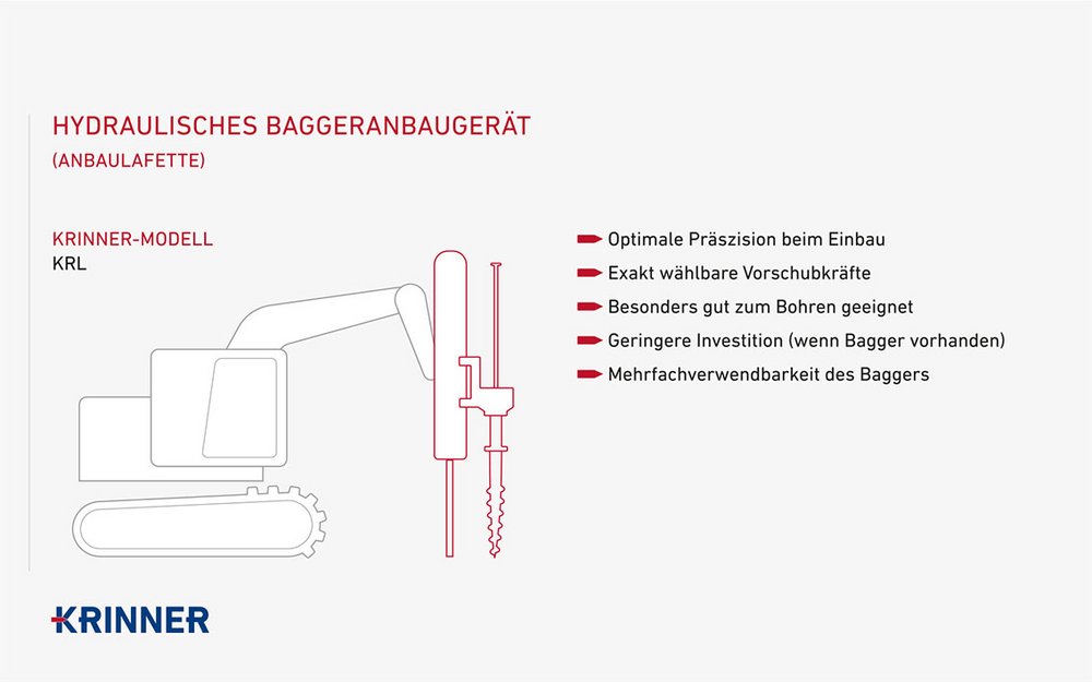 Weitere Vorteile bietet das Pendel durch einen Schlitten am hydraulischen Eindrehaufsatz, der sich automatisch in x-Richtung ausrichtet und damit ein lotgerechtes Eindrehen maschinell unterstützt. Zudem können mit derselben Einheit Vorbohrarbeiten erledigt werden. Damit sind freie Pendel vor allem geeignet, wenn ein sehr harter Boden, im Extremfall sogar felsiger Untergrund vorliegt oder Baustellen an Hangsituationen zu bewältigen sind, die nur mit Hilfe eines Baggerarms zu erreichen sind. KRINNER hat mit der KRB 250 eine Varianten dieses Maschinentyps im Angebot.